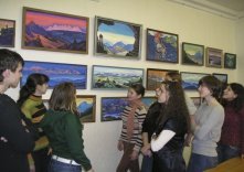 "Копії, виконані відомим київським майстром В.Єрофеєвим, - стверджує Олена Леонідівна, - дають можливість відвідувачам ознайомитись зі значною частиною живописного доробку великого майстра філософської картини. Полотна, представлені на виставці, присвячені красі та величі Гімалайських гір. Суворі лінії гірських піків, холод льодовиків, магічна темрява тіней, фантастичні переливи світла – все це створює величний образ цілісного космосу, що закликає людину віднайти в собі гармонію й умиротворення вічного світу природи. Не випадково, Юрій Гагарін під час свого першого польоту в космос порівнював картини в ілюмінаторі саме з живописними полотнами М.Реріха".