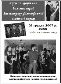 Запитуюсь у студентів філології: "Ви на Новий рік щось влаштовуєте?", "Ні, ми до філософів йдемо!" - відповідають вони. Запитують у психологів: "Ви на Новий рік щось влаштовуєте?". "Ні, ми до філософів йдемо!" - відповідають вони. Тож, чекаємо на всіх в середу о 16:00 в фойе актовго залу на Новорічному балі-маскараді Інституту філософської освіти і науки!!!! На собі мати новорічні костюми, а з собою прекрасні пари!!!