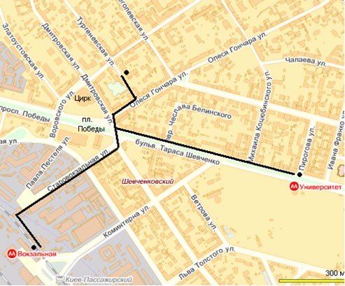 Інший шлях – від ст. метро «Університет»: по бульв. Т. Шевченка до пл. Перемоги, перед цирком поворот направо і по вул. О. Гончара дійти до вул. Тургенєвська.
